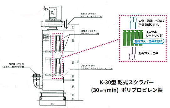 | 小型(乾式)スクラバー K-3型 ステンレス(SUS304)製品 活性炭フィルター付き、最小量の排気処理! 有毒ガス・悪臭を除去し、クリーンな状態で放出 ケミカル排気ファン、活性炭、 プレフィルター、着圧計付、少風量 移動式、コンパクト、高性能、低価格 ※K-3型、K-10型、K-20型の3タイプ ※他に、PVC製、PP製があります >>詳細はこちらへ |
