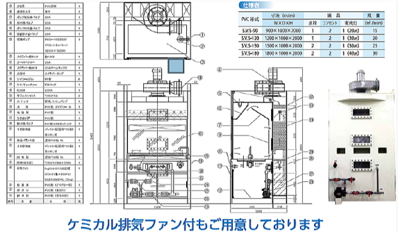 ハイクオリティー・ドラフトチャンバー ドラフトチャンバー・エッチングチャンバーは、すべての面でご満足いただけるように最新の技術が結実された製品です。その他スチール製、ステンレス製、木製と各種用意しております。ケミカルファン、給排水、電気、ダクト工事等は、予めご相談下さい。 |