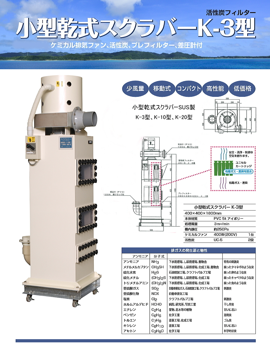 ステンレス(SUS304)製品 活性炭フィルター付き、最小量の排気処理! 有毒ガス・悪臭を除去し、クリーンな状態で放出いたします ケミカル排気ファン、活性炭、プレフィルター 着圧計付、少風量、移動式、コンパクト、高性能、低価格 ※K-3型、K-10型、K-20型の3タイプ ※他に、PVC製、PP製があります ※SUS K-3型の製品を(8分割のアニメーション画像)で掲載 ※下記静止画像の番号クリックで拡大画像でご覧になれます お気軽にお問合せください ![]() |