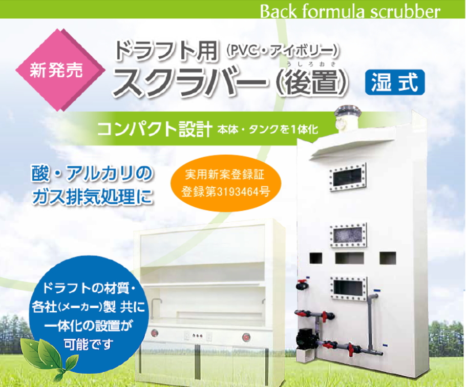 | スクラバー(後置) 湿式・乾式 PVC製 コンパクト設計(本体・タンクを一体化) 酸・アルカリのガス排気処理にドラフトの材質・各社(メーカー)製、共に一体化設置が可能です。湿式と乾式をご用意しております。 ※ポリプロピレン製もご用意しております |