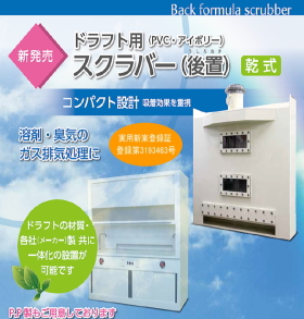 | スクラバー(後置) 乾式 ドラフト用(PVC/アイボリー) コンパクト設計(吸着効果を重視) 溶剤・臭気のガス排気処理に・・・。 ドラフトの材質・各社(メーカー)製、共に一体化設置が可能です。 ※ポリプロピレン製もご用意しております。 ※ケミカル排気ファン付きもご用意しております。 |