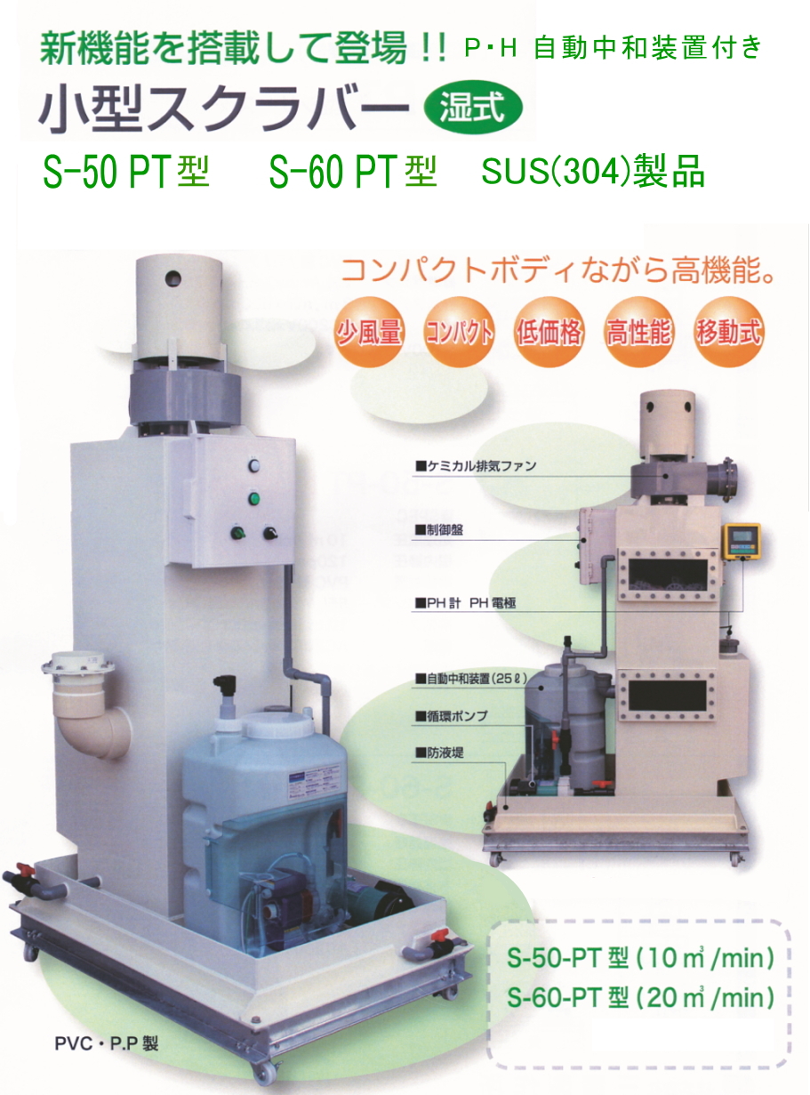 ステンレス(SUS304)製品 S-50 PT型/S-60 PT型シリーズ(湿式) 新機能を搭載して登場 未来の小型スクラバー・パーフェクトタイプ コンパクトのボディーながら高機能 ※小風量、コンパクト、低価格、高性能、移動式 ※P.H自動中和装置付 お気軽にお問合せください |